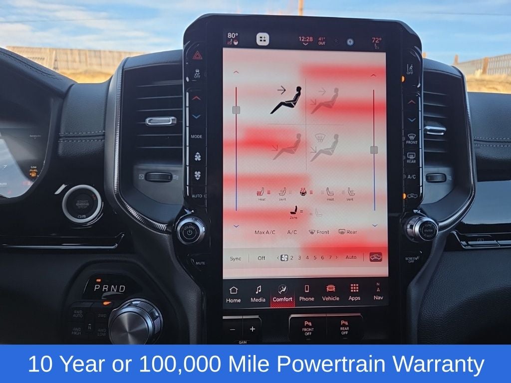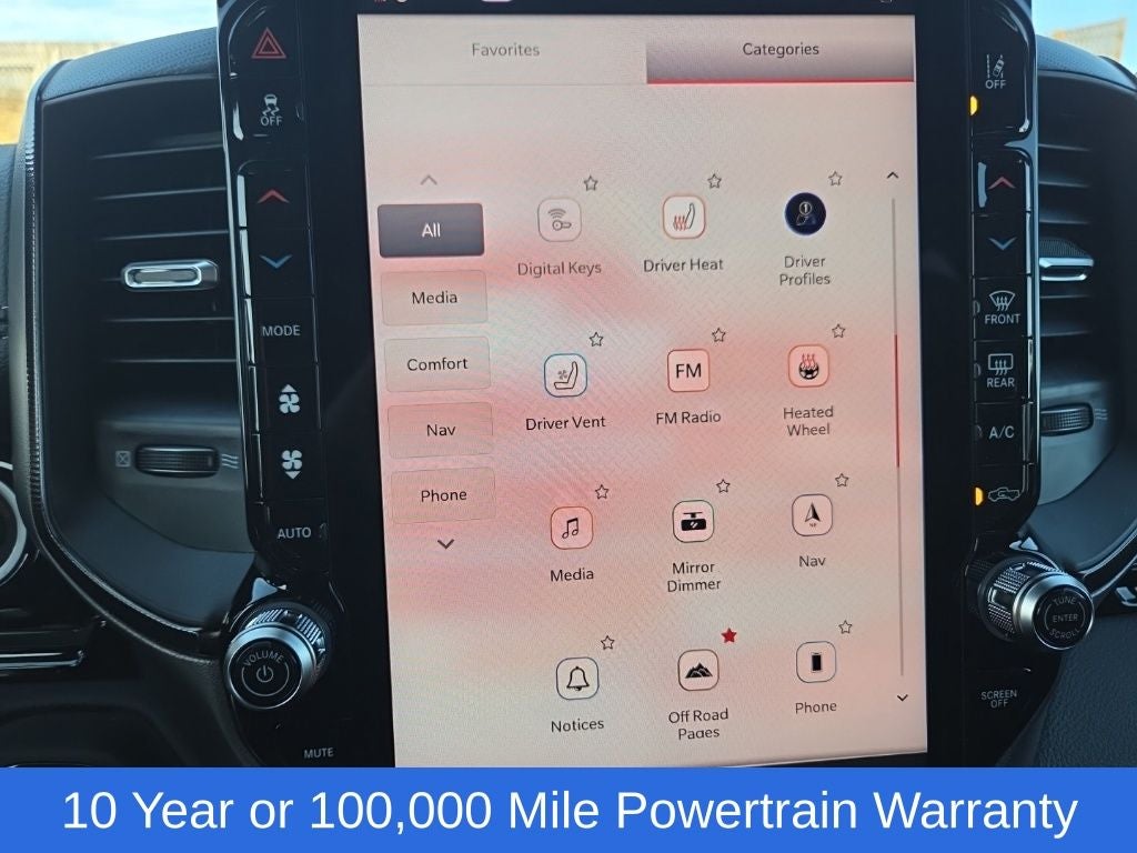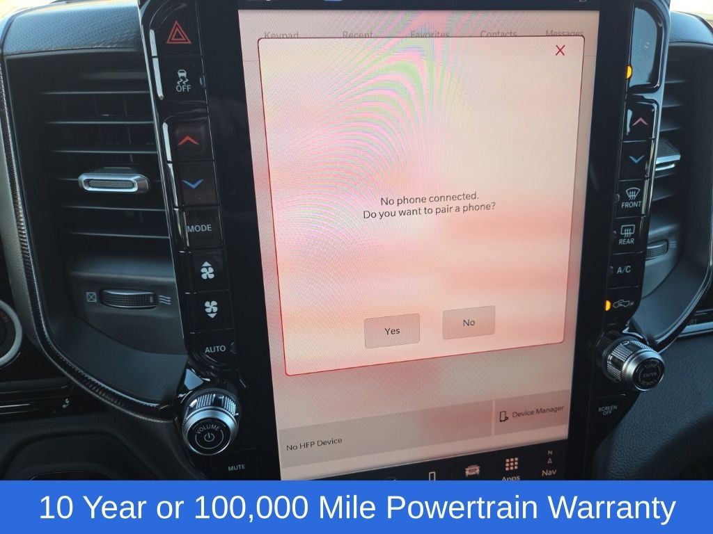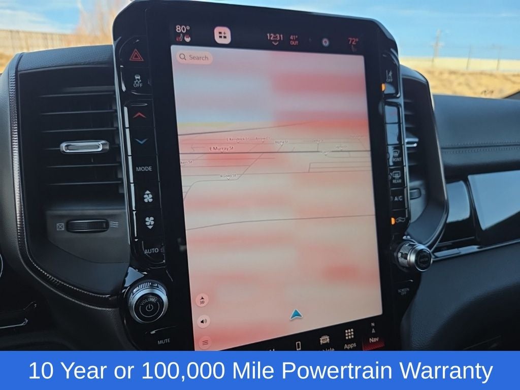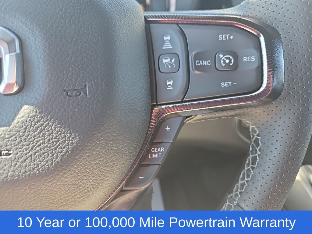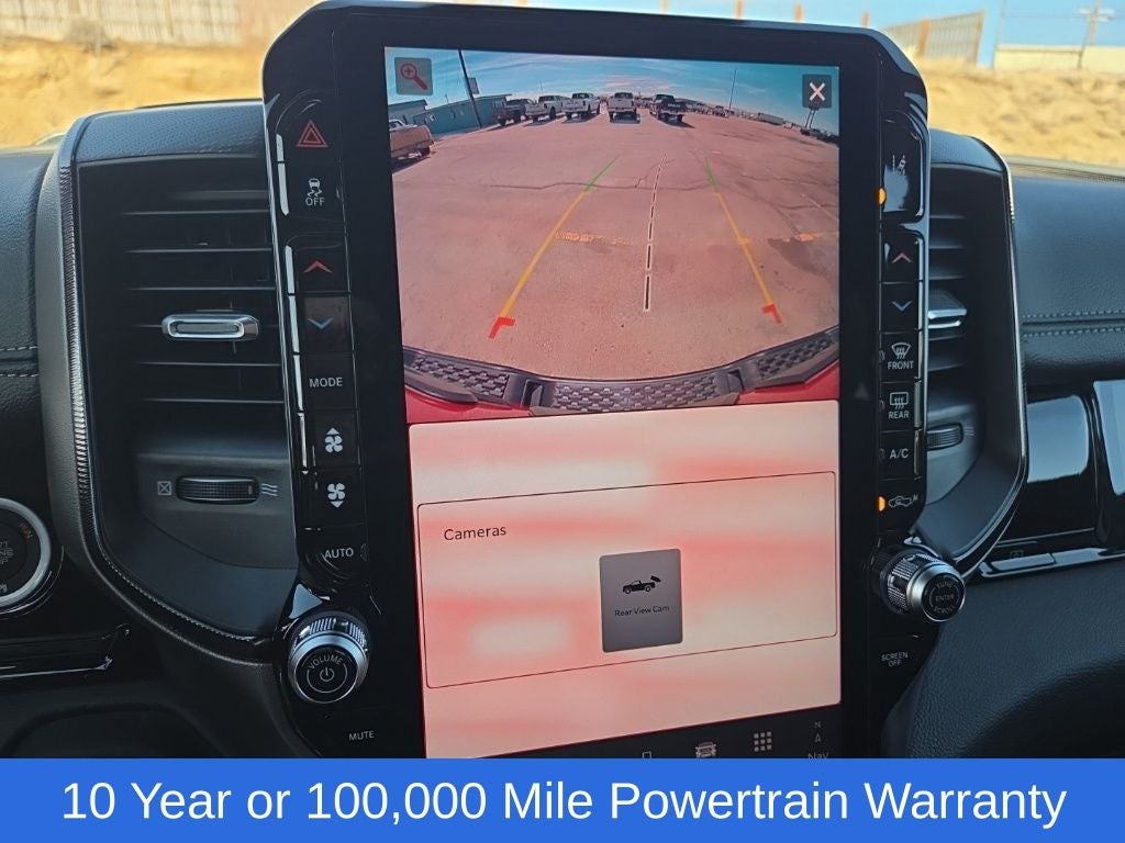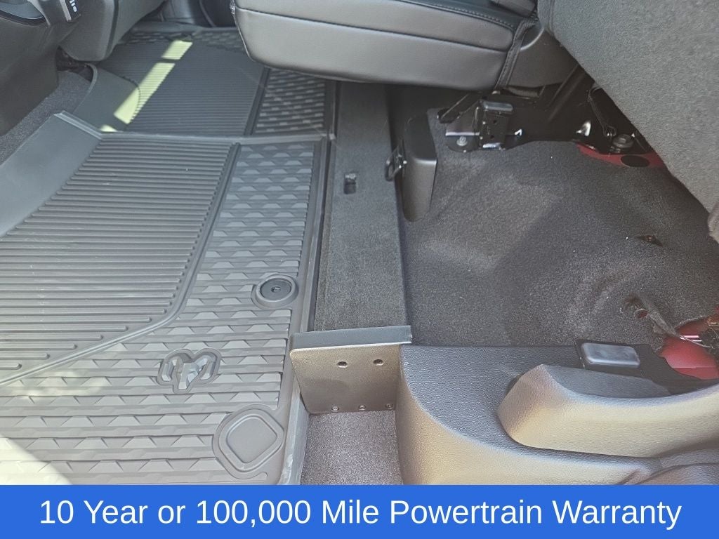 Bed Utility Group (Exterior 115V AC Outlet, MOPAR 4 Adjustable Cargo Tie-Down Hooks, and MOPAR Spray in Bedliner), Quick Order Package 21W Rebel, Rebel Level 2 Equipment Group (115V Auxiliary Rear Power Outlet, 14.4 Touchscreen Display, 2-Door Passive Entry, Front Door Locks, 4G LTE Wi-Fi Hot Spot, Accent Color Door Handles, Accent Color Premium Power Mirrors, Accent Color Tailgate Handle, Apple CarPlay, Auto Power-Folding Mirrors, Auto-Dimming Exterior Driver Mirror, Black Painted Exterior Mirrors Caps, Connected Travel and Traffic Services, Connectivity - US/Canada, Convex Wide-Angle Exterior Mirror Insert, Disassociated Touchscreen Display, Driver Seat Memory, Dual Wireless Charging Pad, Exterior Mirrors Approach Lamps, Exterior Mirrors Courtesy Lamps, Exterior Mirrors with Heating Element, Exterior Mirrors with Memory, Exterior Mirrors with Supplemental Signals, Front Passenger Interactive Display, Global Telematics Box Module, Google Android Auto, GPS Antenna Input, GPS Navigation, Harman/Kardon 19 Speaker Premium Sound, HD Radio, Heated Second Row Seats, Integrated Center Stack Radio, Integrated Voice Command with Bluetooth®, Media Hub with 2 Charge Only USBs, Off-Road Information Pages, Power 2-Way Passenger Lumbar Adjust, Power Adjust 8-Way Front Passenger Seat, Power Adjustable Pedals with Memory, Power Tailgate, Proximity Approach/Departure Lamps, Radio: Uconnect 5 Nav with 14.4 Display, Radio/Driver Seat/Mirrors/Pedals Memory, Rain Sensitive Windshield Wipers, Rear Window Defroster, Security Alarm, SiriusXM Radio Service, SiriusXM with 360L, Smartphone as a Key Capable, and USB Host Flip), 10 Speakers, 3.92 Rear Axle Ratio, 33 Gallon Fuel Tank, 4 Way Front Headrests, 4-Wheel Disc Brakes, ABS brakes, Active Noise Control System, Air Conditioning, Alloy wheels, AM/FM radio: SiriusXM with 360L, Apple CarPlay/Android Auto, Auto High-beam Headlights, Auto-dimming Rear-View mirror, Automatic temperature control, Black Exterior Mirrors, Brake assist, Bucket Seats, Cloth/Vinyl Bucket Seats, Compass, Delay-off headlights, Driver door bin, Driver vanity mirror, Dual front impact airbags, Dual front side impact airbags, Electronic Stability Control, Engine Block Heater, Front anti-roll bar, Front Bucket Seats, Front Center Armrest w/Storage, Front dual zone A/C, Front fog lights, Front License Plate Bracket, Front reading lights, Front Seat Back Map Pockets, Front wheel independent suspension, Full Length Upgraded Floor Console, Fully automatic headlights, Garage door transmitter, Heated door mirrors, Heated Front Seats, Heated front seats, Heated Steering Wheel, Heated steering wheel, Illuminated entry, Leather steering wheel, Low tire pressure warning, Manual Folding Exterior Mirrors, Manufacturer's Statement of Origin, Mopar Black Tubular Side Steps, Navigation System, Occupant sensing airbag, Outside temperature display, Overhead airbag, Overhead console, Panic alarm, ParkView Rear Back-Up Camera, Passenger door bin, Passenger vanity mirror, Power 2-Way Driver Lumbar Adjust, Power Adjust 8-Way Driver Seat, Power door mirrors, Power driver seat, Power steering, Power windows, Radio data system, Radio: Uconnect 5 Navigation with 12.0 Display, Rear 60/40 Folding Seat, Rear anti-roll bar, Rear seat center armrest, Rear step bumper, Rear Wheelhouse Liners, Remote keyless entry, Speed control, Split folding rear seat, Steering wheel mounted audio controls, Tachometer, Telescoping steering wheel, Tilt steering wheel, Traction control, Trailer Brake Control, Trip computer, Variably intermittent wipers, Voltmeter, and Wheels: 18 x 8.0 Painted Mid-Gloss Black.